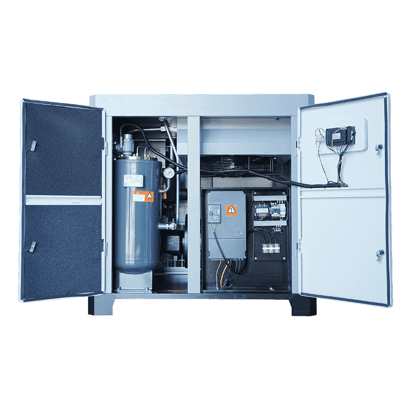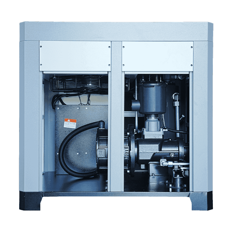 Déantar an córas comhbhrú dhá-scriú a úsáidtear sa mhúnla 50HP a innealtóireacht chun sruth aeir leanúnach a sholáthar le sceitheadh inmheánach íosta agus aschur brú comhsheasmhach. Cuidíonn an buntáiste struchtúrach seo le cobhsaíocht fuinnimh a chothabháil le linn oibriú leathnaithe. I gcomparáid le loine traidisiúnta nó aonaid ilchéime, cuireann an fhormáid aon-chéim dhá scriú ar chumas an chomhbhrúiteora an sruth aeir riachtanach a sheachadadh ar bhealach níos éifeachtaí. Cuidíonn an próiseas comhbhrúite inmheánach cobhsaí le luaineachtaí a laghdú a d'fhéadfadh tomhaltas a ardú. Thar thréimhsí fada, cinntíonn an seastacht seo go ndéanann an comhbhrúiteoir a chúraimí gan méaduithe cumhachta gan ghá, ag tacú le húsáid fuinnimh intuartha agus rialaithe i dtimpeallachtaí éilitheacha.